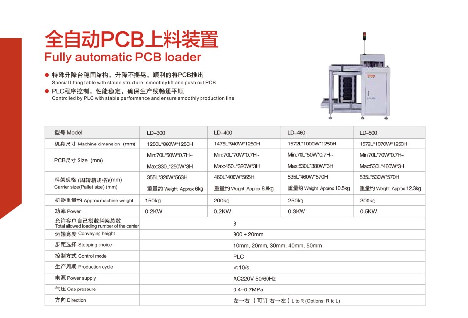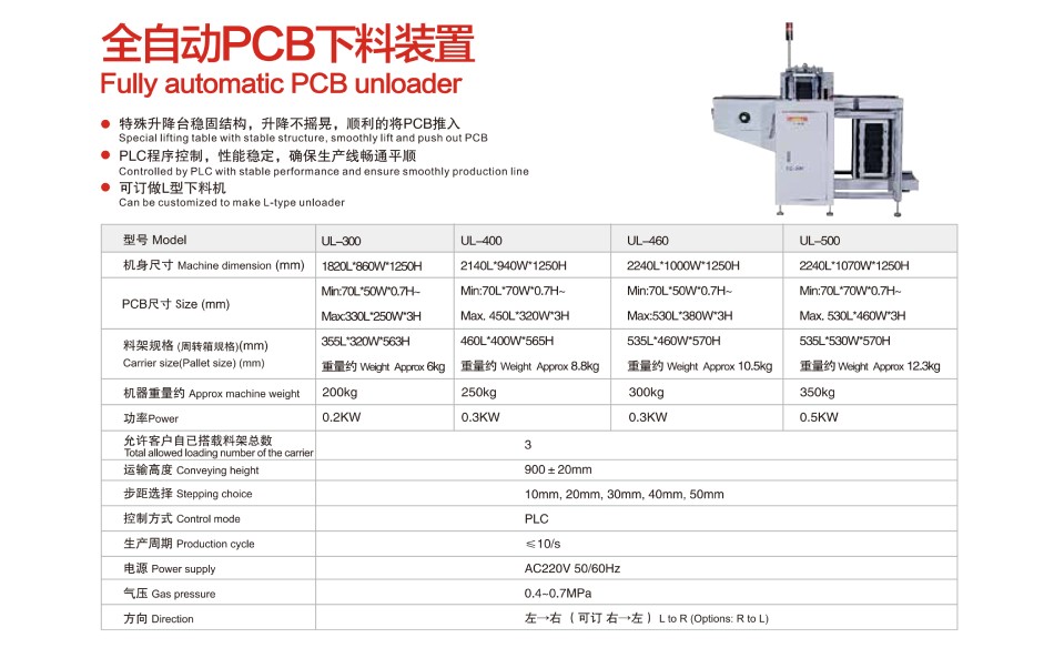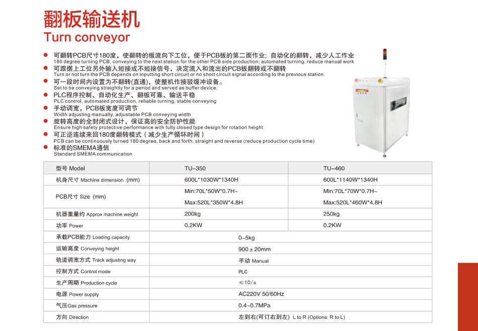 SMT周邊設備主要有:全自動PCB上下料機、平行移載機、PCB儲板機、NG/OK緩存機、接駁臺、光板真空上料機、翻板輸送機等小型機。