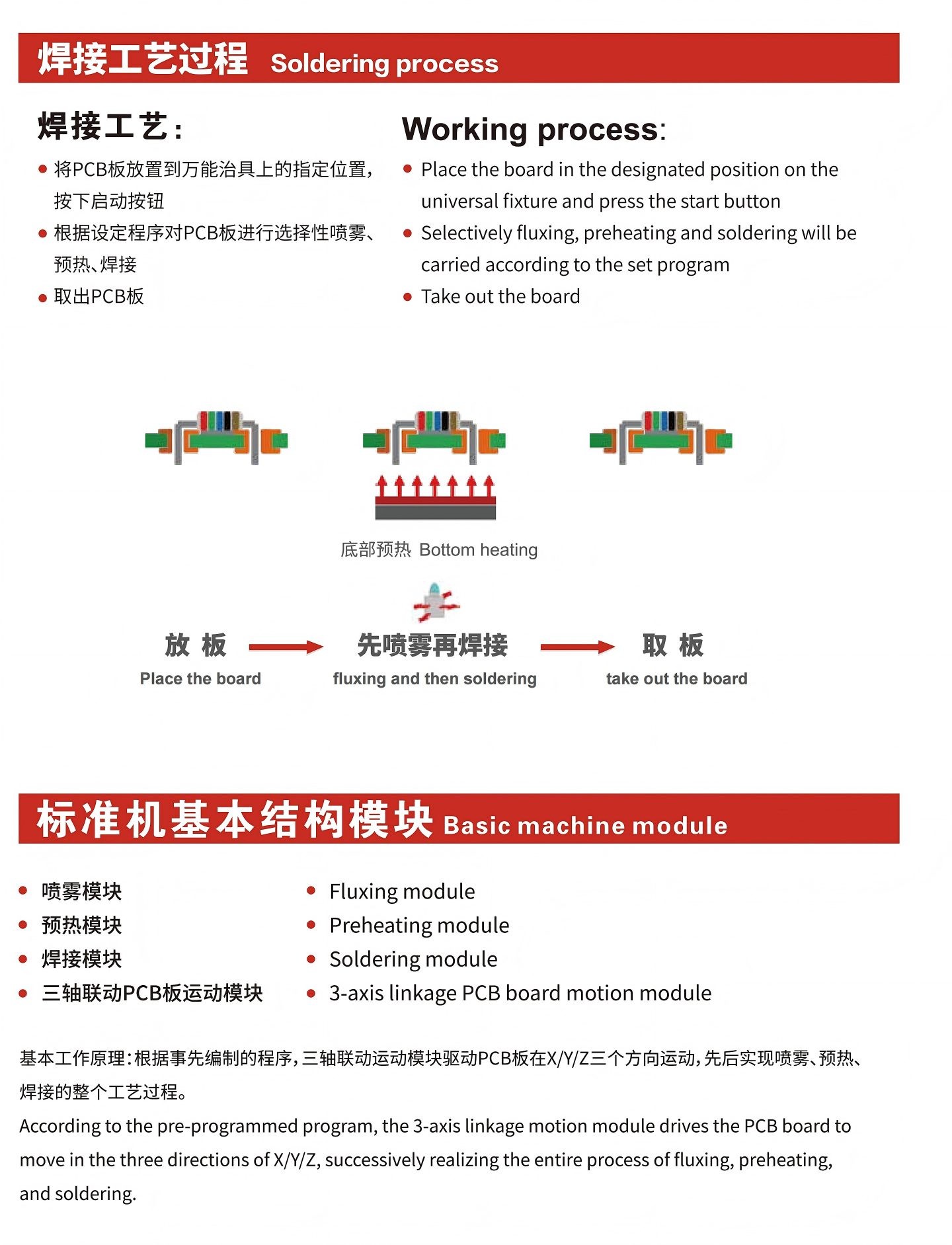 三軸聯(lián)動(dòng)運(yùn)動(dòng)系統(tǒng):手動(dòng)放板,搭載萬能治具,錫爐固定不動(dòng),PCB板在X/Y/Z三軸方向運(yùn)動(dòng),實(shí)現(xiàn)焊接;