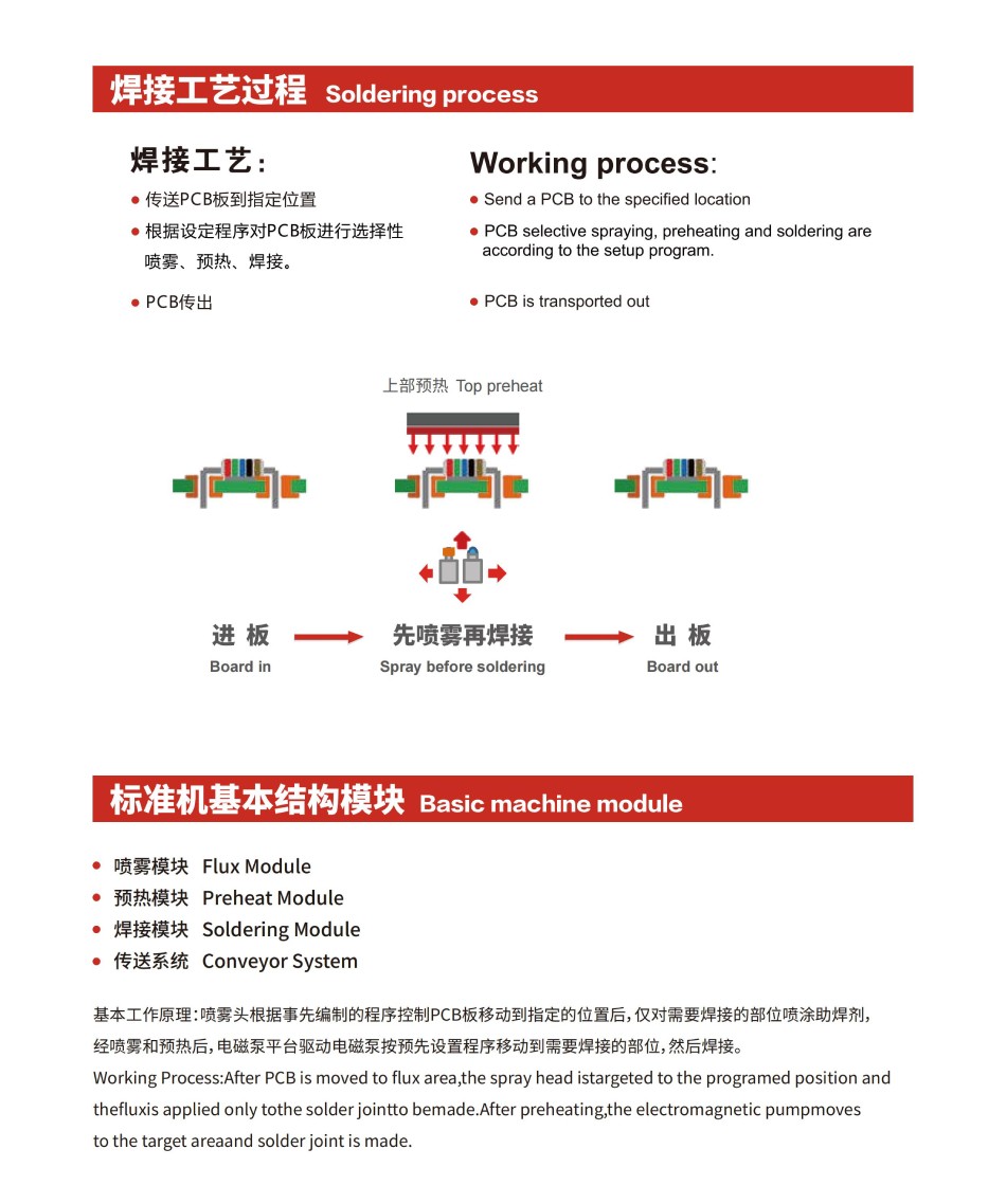 基本工作原理:噴霧頭根據事先編制的程序控制PCB板移動到指定的位置后, 僅對需要焊接的部位噴涂助焊劑,經噴霧和預熱后,電磁泵平臺驅動電磁泵按預先設置程序移動到需要焊接的部位,然后焊接。