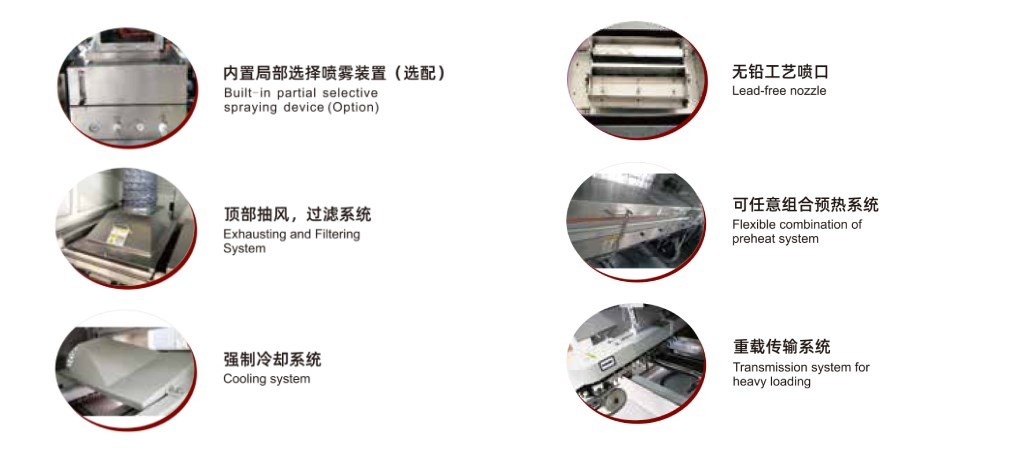 預(yù)熱系統(tǒng):優(yōu)化微熱風(fēng)循環(huán)路徑,溫區(qū)內(nèi)溫度更均勻穩(wěn)定;噴霧抽風(fēng)系統(tǒng):采用全新理念,分體式設(shè)計(jì),維護(hù)保養(yǎng),方便快捷;內(nèi)置局部選擇噴霧裝置(選配):是步進(jìn)電機(jī)通過同步帶及滾珠絲桿,直線導(dǎo)軌等作X和Y方向的運(yùn)動來實(shí)現(xiàn)局部選擇噴涂助焊劑。