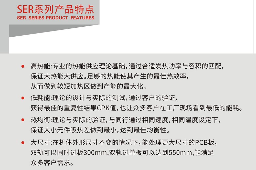 熱均衡:理論與實際的驗證,與同行通過相同速度,相同溫度設定下,保證大小元件吸熱差做到最小,達到最佳均衡性。